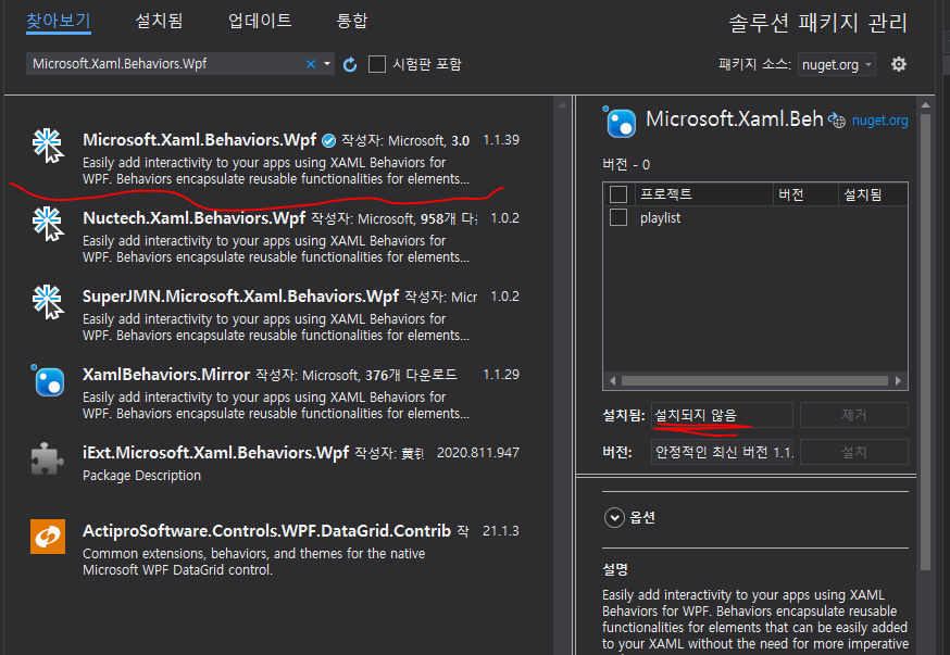 그다음 Nuget package에 Microsoft.Xaml.Behaviors.Wpf 추가해야한다.