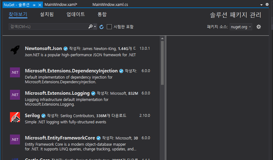 솔루션용 NuGet패키지 관리 클릭