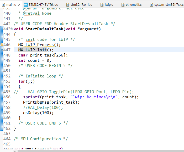 task를 만들어서 led, uart 통신을 하고 있는데 LWIP만 돌면 보드가 뻗는 이슈 발생..